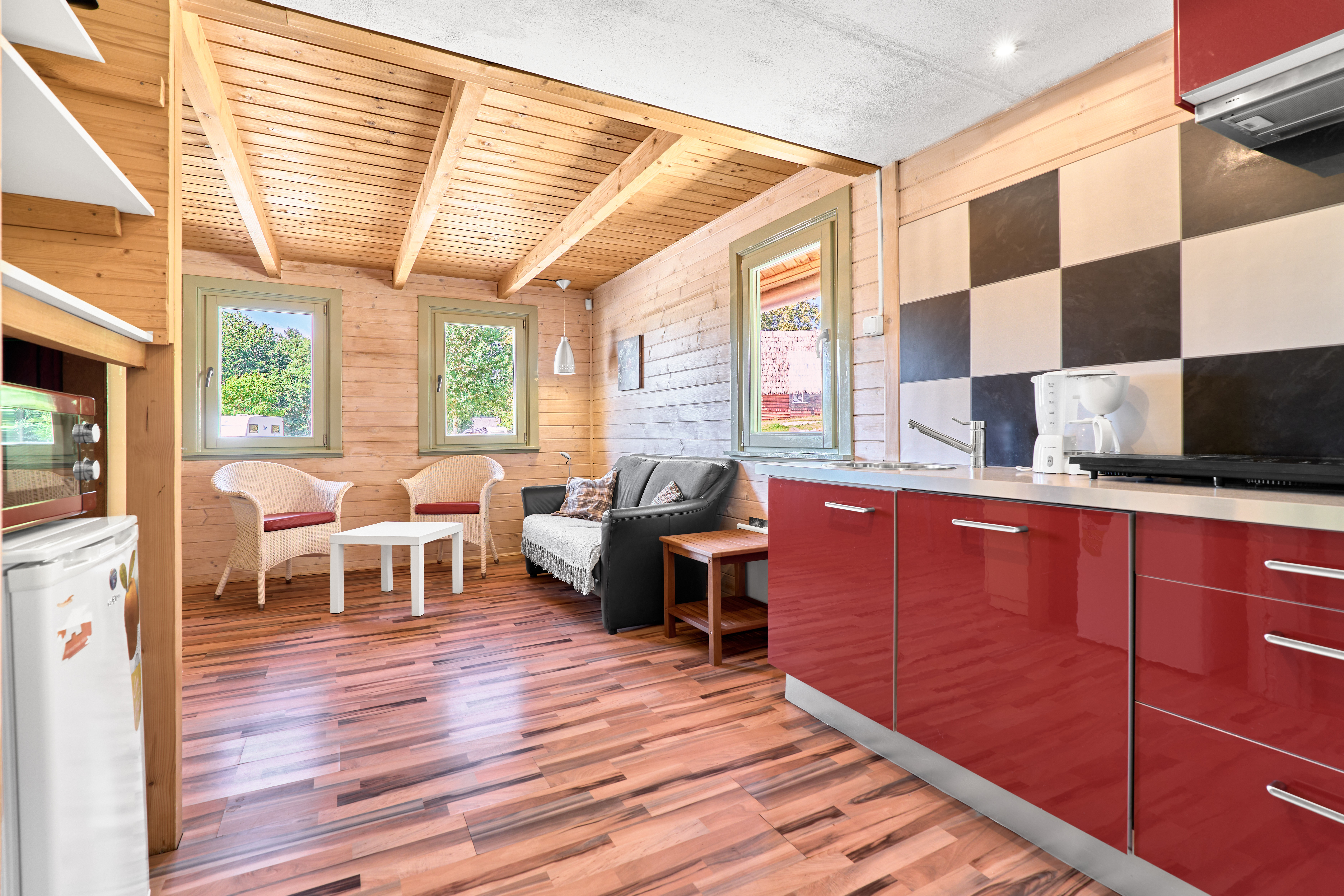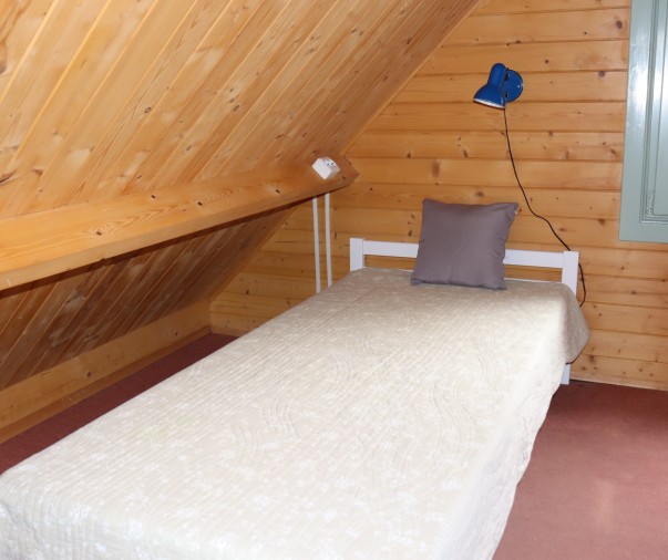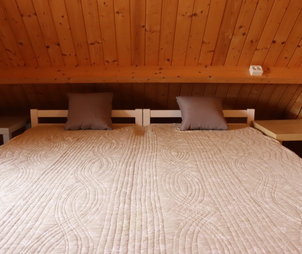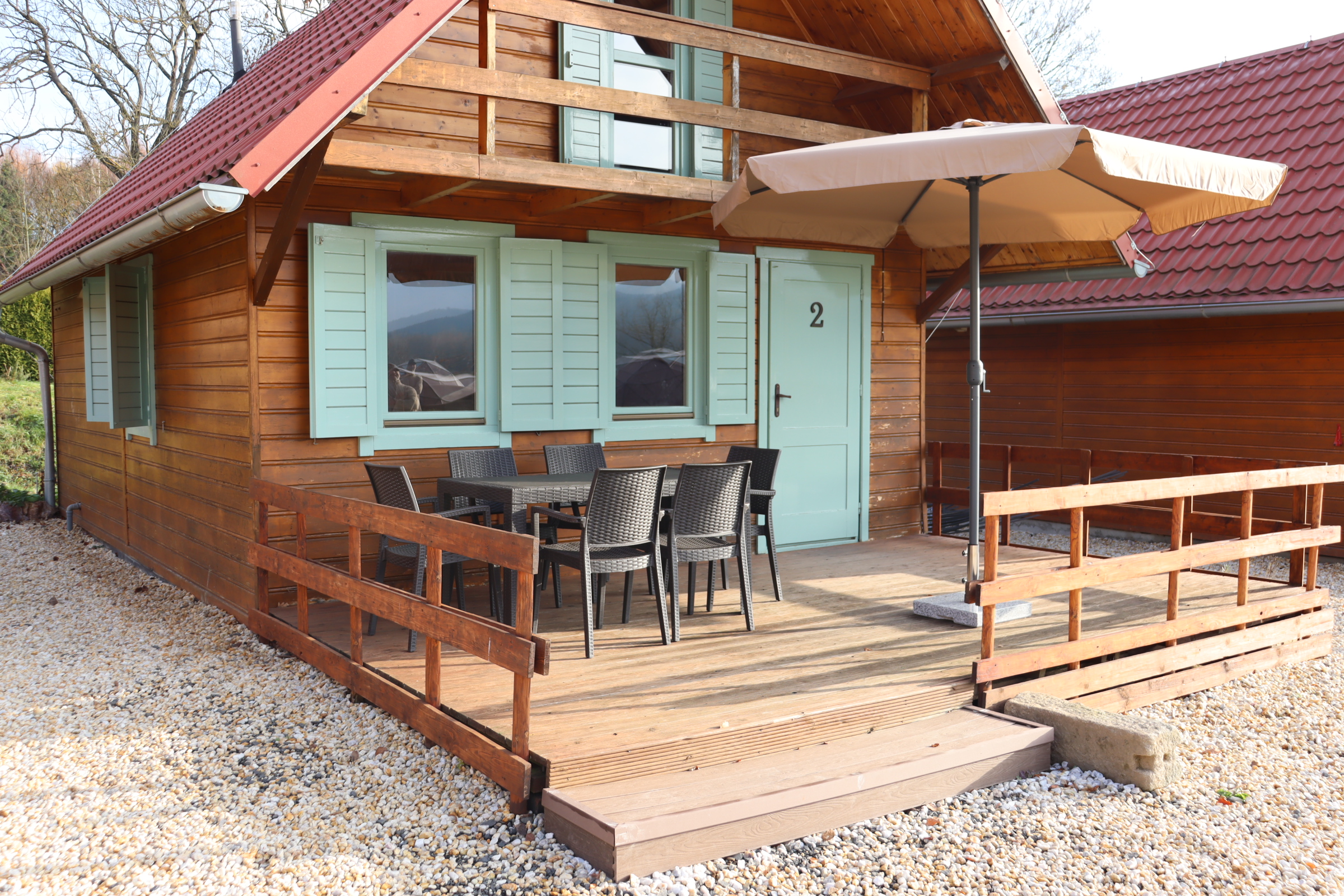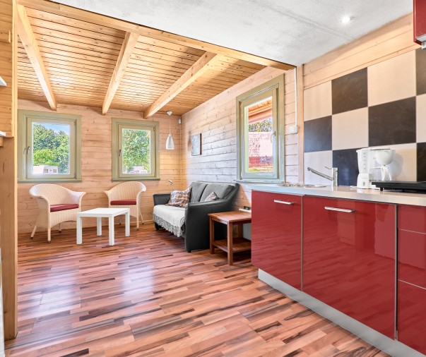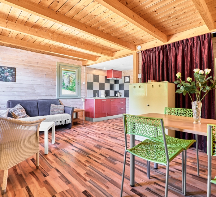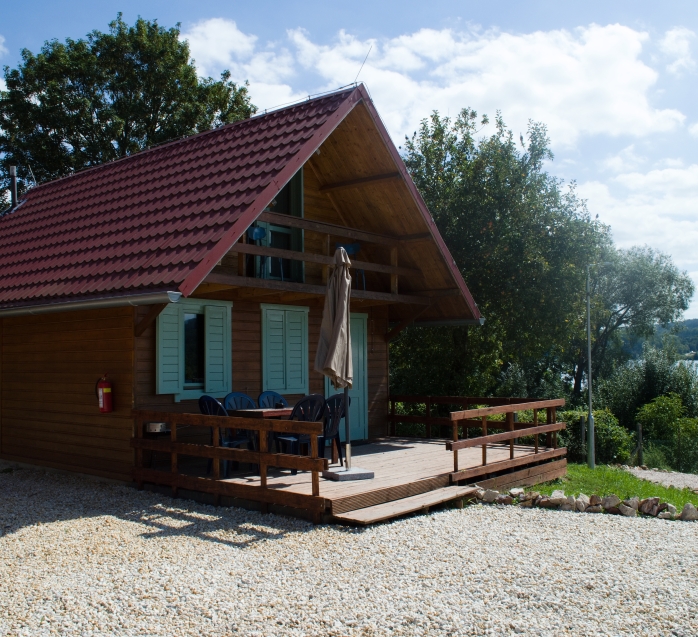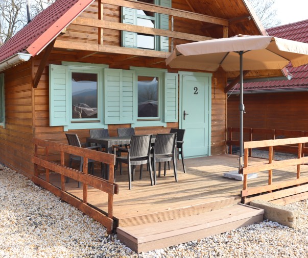 Útulná dřevěná rekreační chata s terasou, vlastní kuchyní, koupelnou a třemi ložnicemi