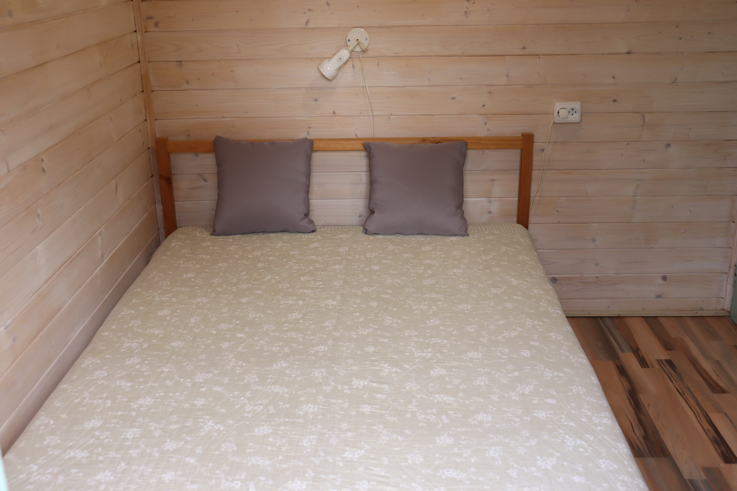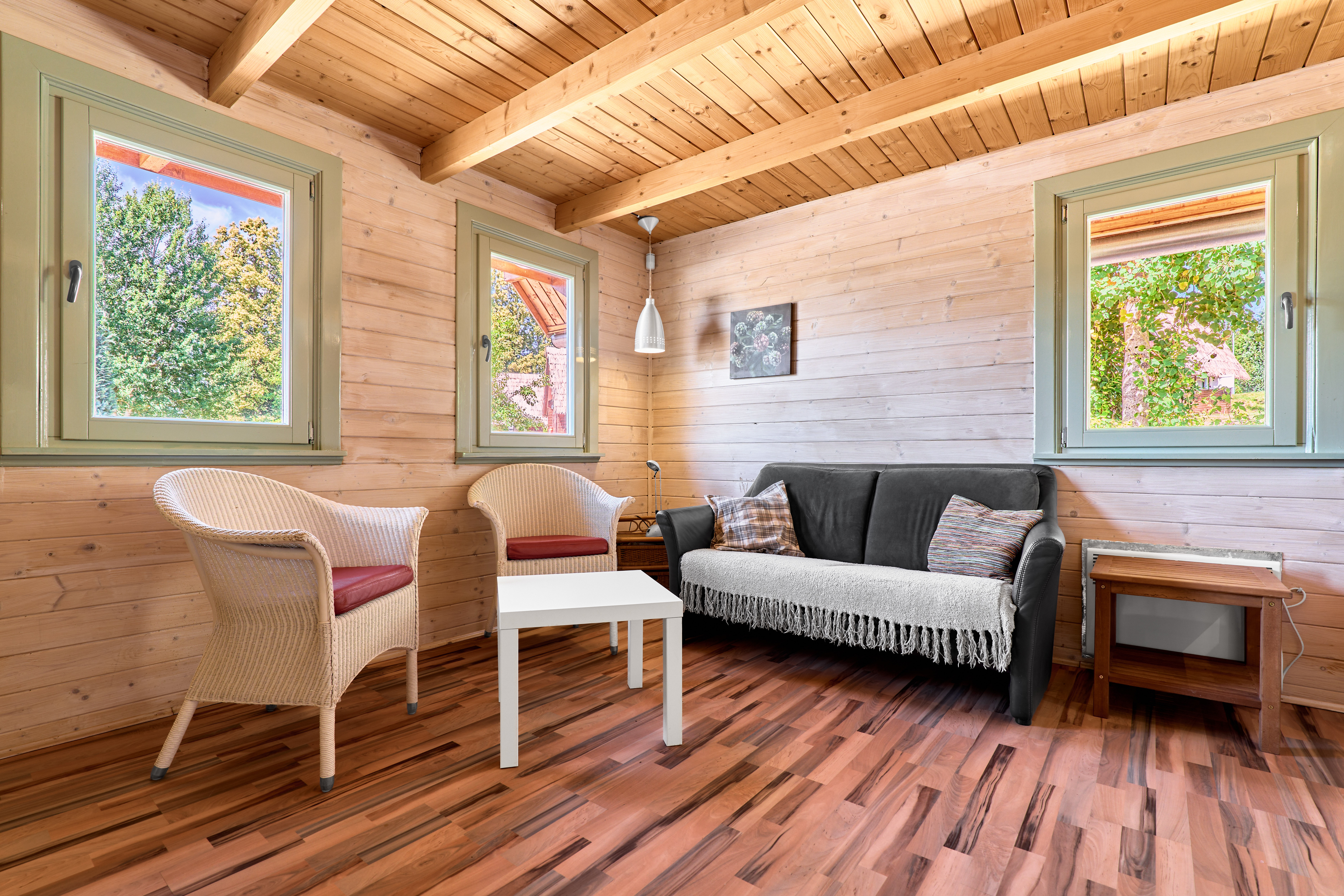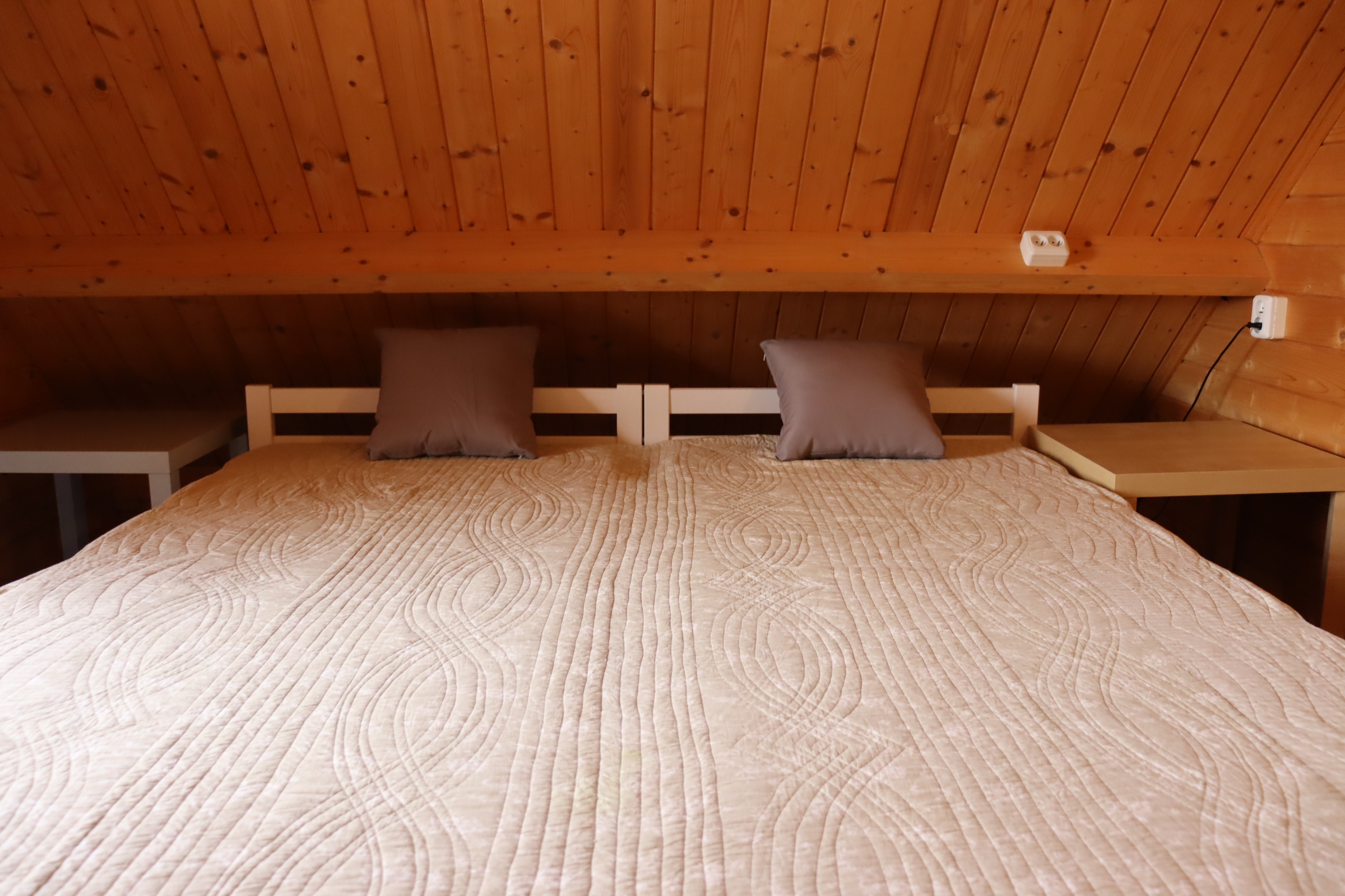 Útulná dřevěná rekreační chata s terasou, vlastní kuchyní, koupelnou a třemi ložnicemi